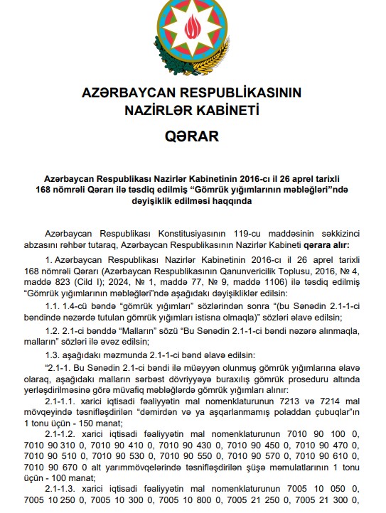 Azərbaycanda 9 ay müddətinə yeni gömrük yığımları müəyyənləşdirilib. Gömrük yığımlarına əlavə olaraq, Azərbaycana gətirilən dəmirdən və ya aşqarlanmamış poladdan çubuqların 1 tonu üçün 150 manat, şüşə məmulatlarının 1 tonu üçün 100 manat, armaturlaşdırılmamış şüşələrin 1 tonu üçün 100 manat alınacaq.Gömrük yığımlarına əlavə olaraq, dəmirdən və ya aşqarlanmamış poladdan çubuqların 1 tonu üçün 150 manat alınacaq.