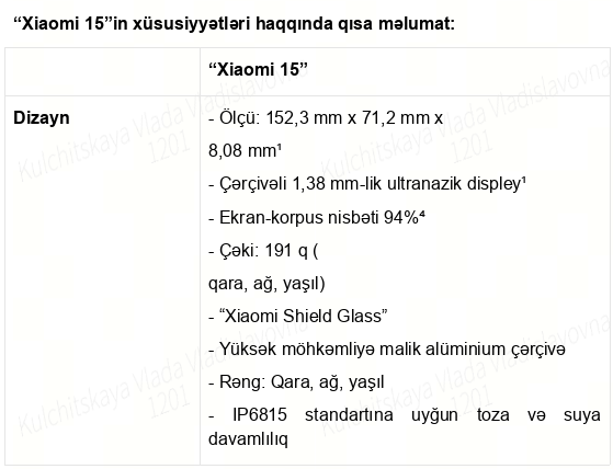 “Xiaomi 15”in dizaynı cihazın möhkəm və davamlı olması üçün düşünülüb. Mikro səviyyədə əyilmiş alüminium çərçivə möhkəmliyi 33% artırmağa imkan verir.¹