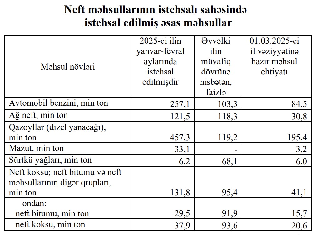 2025-сi ilin yanvar – fevral ayları ərzində Azərbaycanda neft məhsullarının istehsalı sahəsində istehsalın ümumi dəyəri 1 milyard 29,1 milyon manat olmaqla, əvvəlki ilin müvafiq dövrü ilə müqayisədə 15,6 faiz artmışdır.