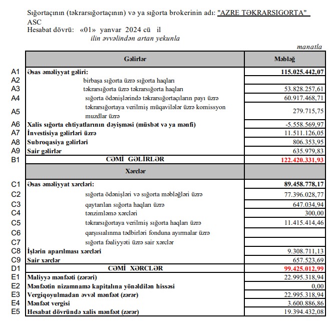 "AzRe Təkrarsığorta" ASC 2024-cü ili 24 milyon 242 min manat xalis mənfəət ilə başa vurub. Şirkət 2023-cü ili 19 milyon 394 min manat xalis mənfəət ilə bağlamışdı. Beləliklə, "AzRe Təkrarsığorta"nın xalis mənfəəti 2024-cü ildə 2023-cü illə müqayisədə 4 milyon 848 min manat və ya 25% artıb.