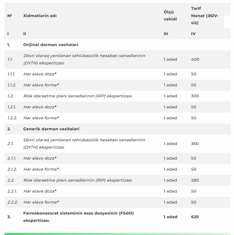 Dərman vasitəsi dövlət qeydiyyatına alındıqdan sonra təqdim edilən farmakonəzarət sənədləri ilə bağlı ekspertiza xidmətlərinin tarifləri tənzimlənib.
