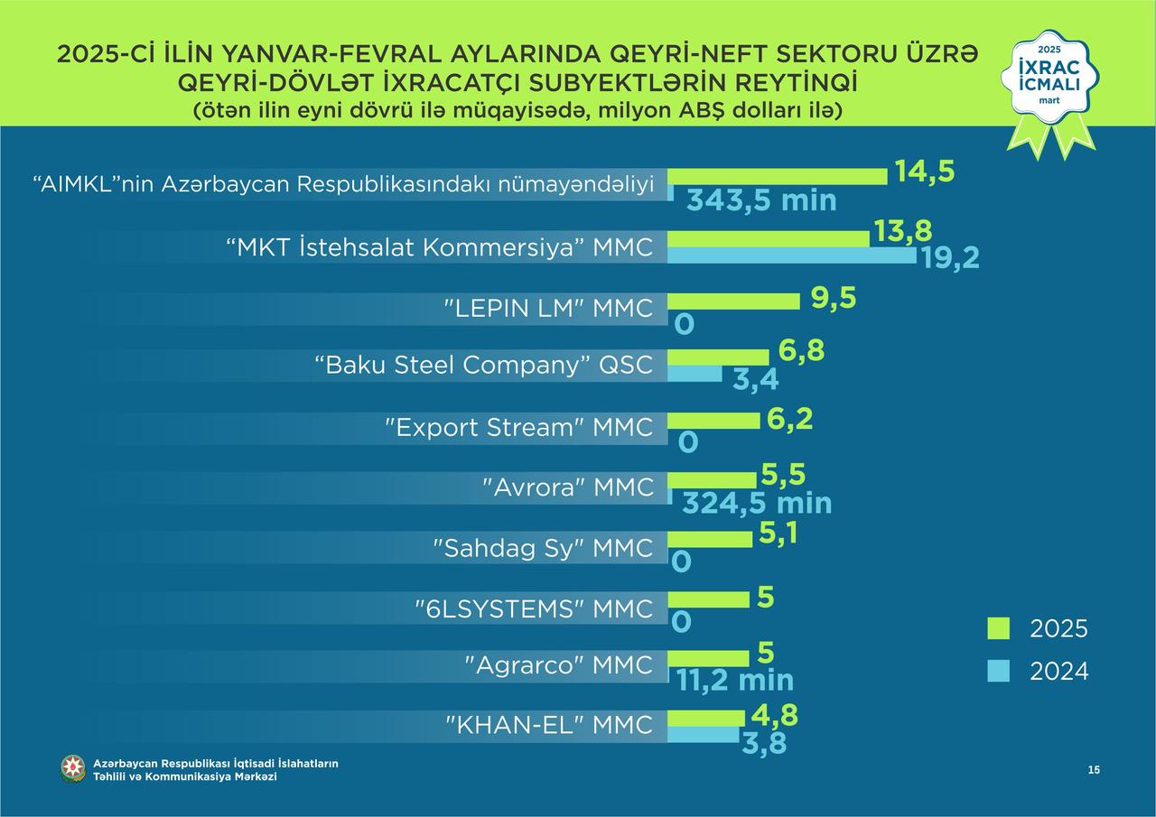 2025-ci ilin yanvar-fevral ayları üzrə hazırlanmış qeyri-dövlət ixracatçı subyektlərin reytinqində ilk onluqda aşağıdakı şirkətlər təmsil olunublar: "Azərbaycan İnterneyşnl Mayninq Kompani Limited Şirkəti"nin Azərbaycan Respublikasındakı Nümayəndəliyi, "MKT İstehsalat Kommersiya" MMC, "LEPIN LM" Məhdud Məsuliyyətli Cəmiyyəti, "Baku Steel Company" QSC, "Export Stream" Məhdud Məsuliyyətli Cəmiyyəti, "Avrora" Məhdud Məsuliyyətli Cəmiyyəti, "Sahdag Sy" Məhdud Məsuliyyətli Cəmiyyəti, "6LSYSTEMS" MMC,"Agrarco" MMC, "KHAN-EL" MMC.