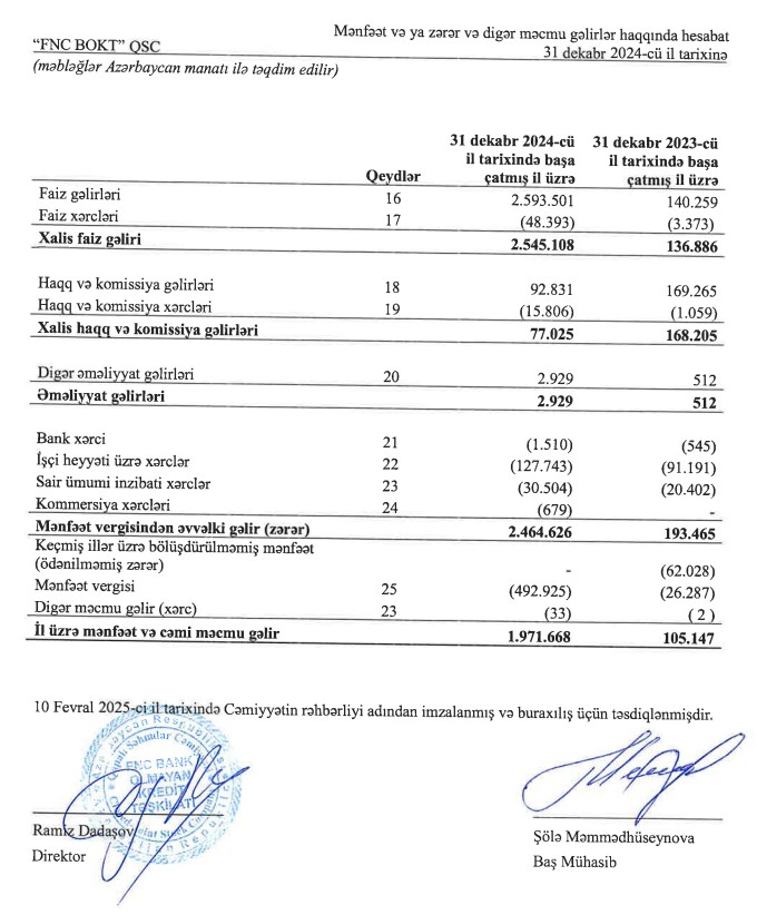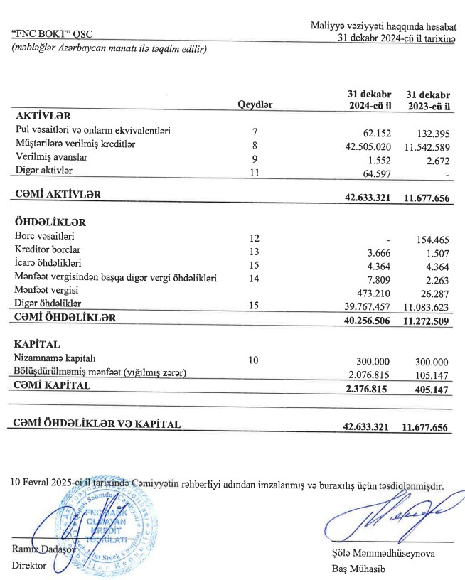 Ötən il "FNC BOKT"ın kredit portfeli (müştərilərə verilmiş kreditlər) 3,7 dəfə və ya 30 milyon 962 min manat artaraq 31 dekabr 2024-cü il tarixində 42 milyon 505 min manata çatıb.