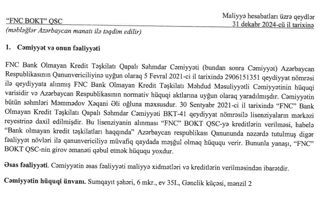 Kreditlərin verilməsilə məşğul olan "FNC BOKT" QSC-nin hüquqi ünvanı Sumqayıt şəhəri, 6-cı mikrorayon, Ev 35L, Gənclik küçəsi mənzil 2-dir. Təşkilatın faktiki ünvanı isə Bakı şəhəri, Nəsimi rayonu, Hüseynbala Əliyev küçəsi, 32/24-dür.