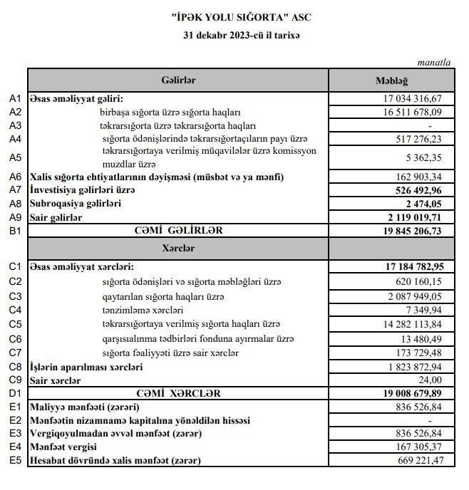 "İpək Yolu Sığorta" ASC 2024-cü ili 1 milyon 568 min manat xalis mənfəət ilə başa vurub. Şirkət 2023-cü ili 669 min manat xalis mənfəət ilə bağlamışdı. Beləliklə, "İpək Yolu Sığorta"nın xalis mənfəti 2024-cü ildə 2023-cü illə müqayisədə 898 min manat və ya 2,3 dəfə artıb.