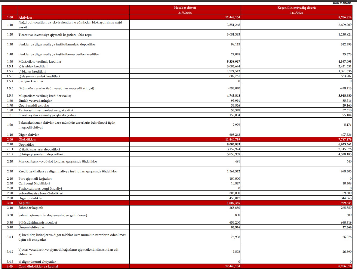 Marja.az-ın məlumatına görə, 2025-ci ilin ilk rübündə "Kapital Bank" böyüyüb - cəmi aktivləri (cümlədən kredit portfeli), gəlirləri artıb.