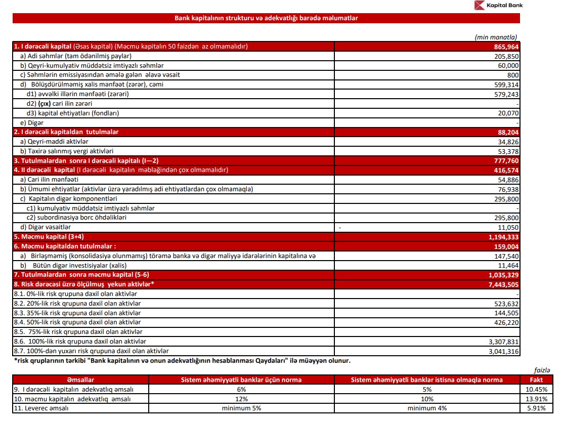 2024-cü ilin sonu ilə müqayisədə 2025-ci ilin 1-ci rübündə "Kapital Bank"ın cəmi aktivləri 1 milyard 75 milyon 834 min manat və ya 9,5% artaraq 31 Mart 2025-ci il tarixində 12 milyard 448 milyon 104 min manata, o cümlədən kredit portfeli (müştərilərə verilmiş kreditlər) 127 milyon 709 min manat və ya 2,5% artaraq 31 mart 2025-ci il tarixində 5 milyard 338 milyon 917 min manata çatıb.
