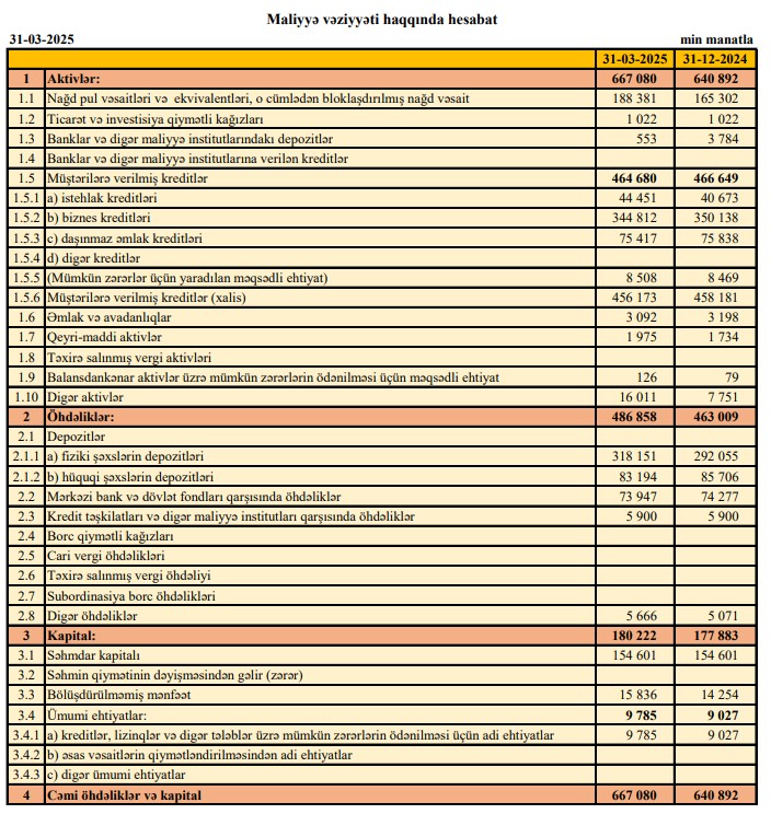 "Premium Bank"ASC 2025-cü ilin 1-ci rübü (yanvar-mart) üzrə maliyyə göstəricilərini açıqlayıb.