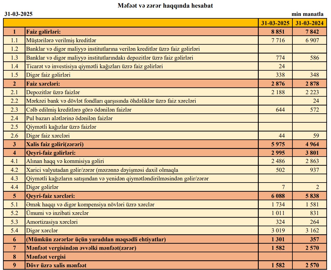 "Premium Bank" ASC 2025-ci ilin 1-ci rübünü (yanvar-mart) 1 milyon 582 min manat xalis mənfəət ilə başa vurub. Bank 2024-cü ilin 1-ci rübünü 2 milyon 570 min manat xalis mənfəət ilə bağlamışdı. Xalis mənfəətin azalması Bankın gələcəkdə baş verə biləcək zərərləri ödəmək üçün yaradılan ehtiyata daha çox ayırma etməsilə əlaqədardır. Bu ayırma Bankın maliyyə dayanıqlılığı baxımdan vacibdir.