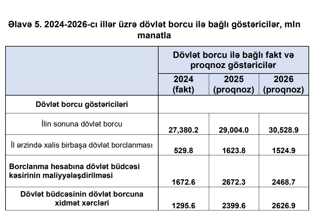 2024-2026-cı illər üzrə dövlət borcu ilə bağlı göstəricilər açıqlanıb.