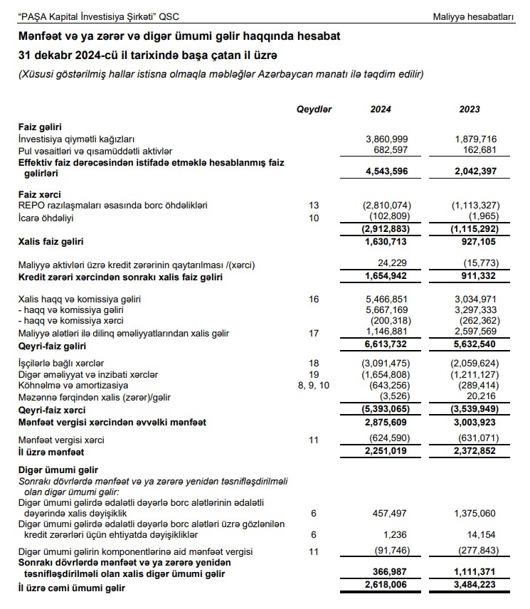 2024-cü ildə “PAŞA Kapital İnvestisiya Şirkəti”nin cəmi əməliyyat gəlirləri (faiz və qeyri-faiz xərcləri) 11 milyon 181 min manat, cəmi əməliyyat xərcləri (faiz və qeyri-faiz xərcləri) 8 milyon 306 min manat, əməliyyat mənfəəti 2 miylon 875 min manat təşkil edib. Şirkət əməliyyat mənfəətindən 624 min manat mənfəət vergisi ödəyib.
