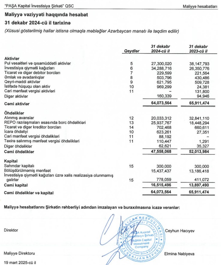 31 dekabr 2024-cü il tarixində “PAŞA Kapital İnvestisiya Şirkəti” QSC 64 milyon 74 min manat cımi aktivlərə malik olub. Şirkət 2023-cü ilin sonunda 65 milyon 911 min manat cəi aktivlərə malik idi.