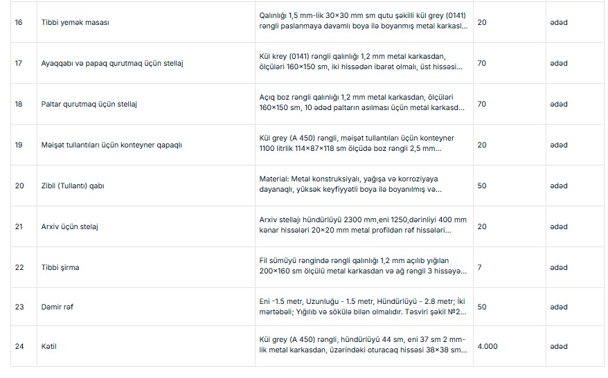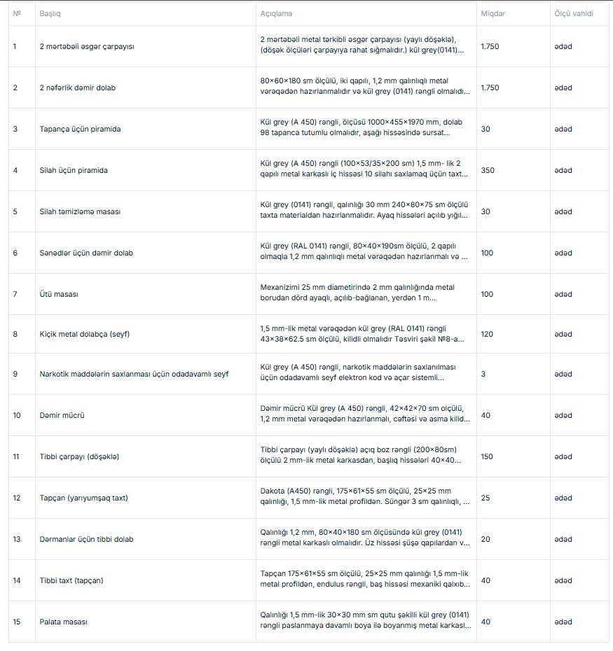 Azərbaycan Respublikası Müdafiə Nazirliyi "Azərbaycan Ordusunun hərbi hissələri üçün metal tərkibli mebel, kazarma inventarlarının quraşdırılması ilə birlikdə satın alınması" ilə bağlı tenderi yekunlaşdırıb.