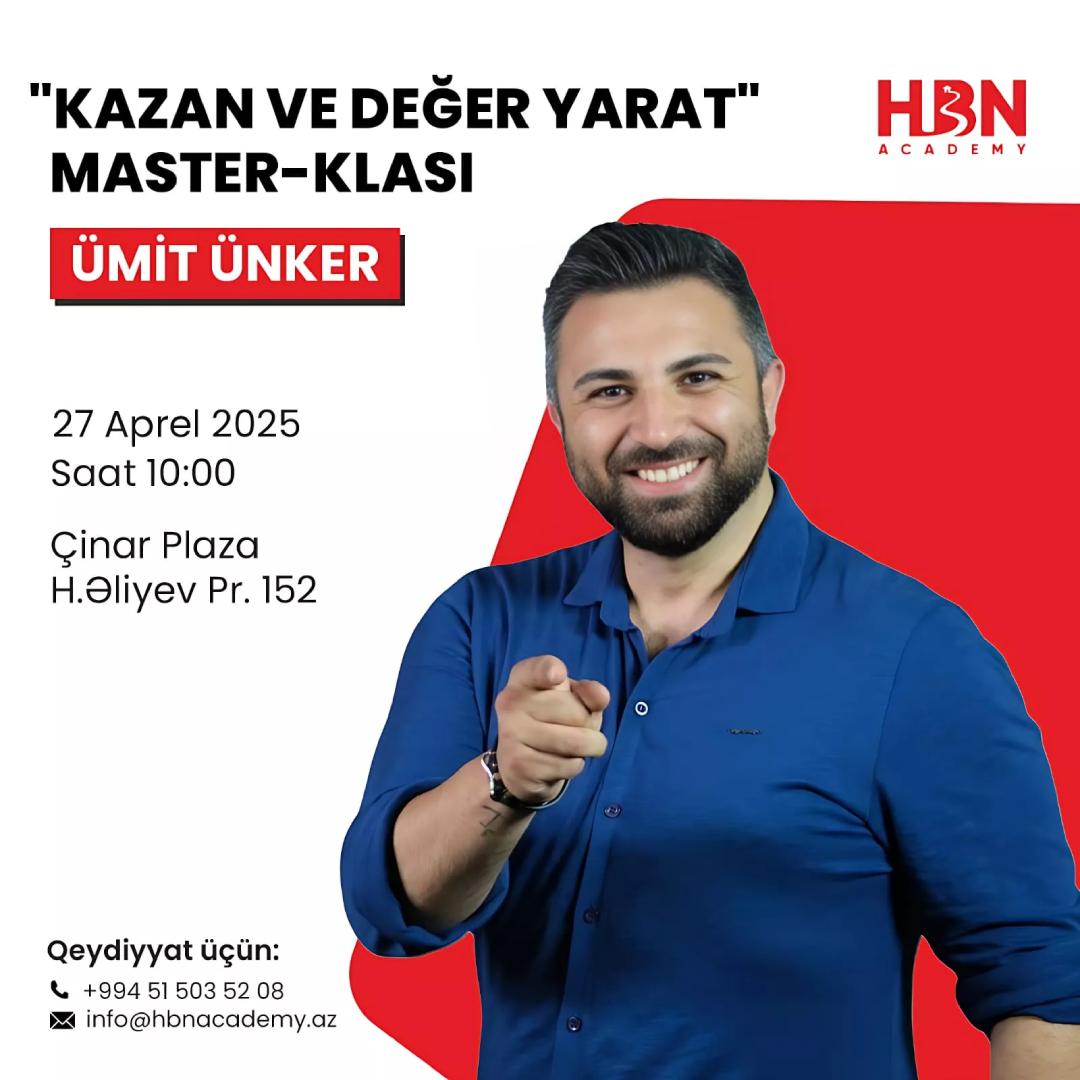 (®) "HBN Group"ın təşkilatçılığı ilə, Türkiyənin tanınmış eksperti Ümit Ünker Bakıda "Qazan və Dəyər Yarat" (Kazan ve Değer Yarat) adlı master- klas keçirəcək.