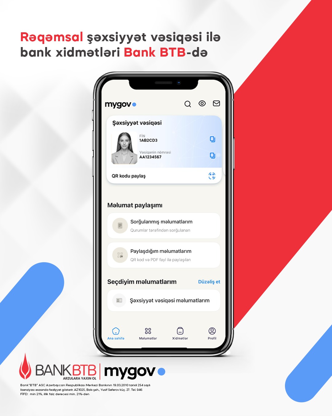 Qeyd edək ki, Azərbaycan Respublikası Prezidentinin 16 iyul 2024-cü il tarixli Fərmanına əsasən, şəxsiyyət vəsiqəsi məlumatlarının “mygov” platforması üzərindən təqdim edilməsi fiziki sənədin təqdim edilməsi ilə eyni hüquqi qüvvəyə malikdir.