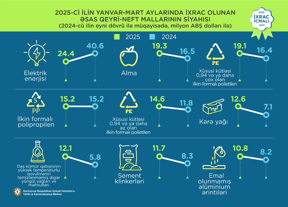 2025-ci ilin mart ayında Rusiya Federasiyasına 82,1 milyon ABŞ dolları, Türkiyəyə 51,5 milyon ABŞ dolları, Gürcüstana 27,7 milyon ABŞ dolları, İsveçrəyə 26 milyon ABŞ dolları, BƏƏ isə 10,7 milyon ABŞ dolları dəyərində qeyri-neft sektoruna aid mal ixrac edilib.