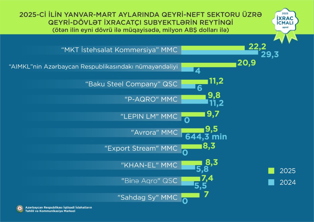 Marja.az xəbər verir ki, 2025-ci ilin yanvar-mart ayları üzrə hazırlanmış qeyri-dövlət ixracatçı subyektlərin reytinqində ilk onluqda aşağıdakı şirkətlər təmsil olunublar: "MKT İstehsalat Kommersiya" MMC,"Azərbaycan İnterneyşnl Mayninq Kompani Limited Şirkəti"nin Azərbaycan Respublikasındakı Nümayəndəliyi,"Baku Steel Company" QSC,"P-AQRO" MMC,"LEPIN LM" Məhdud Məsuliyyətli Cəmiyyəti,"Avrora" Məhdud Məsuliyyətli Cəmiyyəti, "Export Stream" Məhdud Məsuliyyətli Cəmiyyəti,"KHAN-EL" MMC,"BİNƏ AQRO" QSC,"Sahdag Sy" Məhdud Məsuliyyətli Cəmiyyəti.