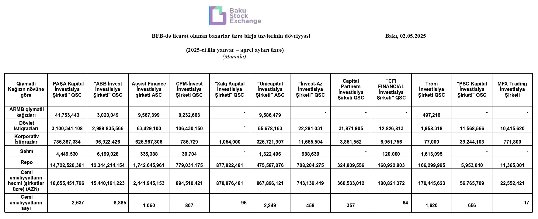Birjanın yaydığı məlumata görə, 2025-ci ilin yanvar – aprel ayları üzrə “PAŞA Kapital İnvestisiya Şirkəti” QSC 18 milyard 655 milyon 452 min manat dövriyyə ilə 1-ci, "ABB İnvest İnvestisiya Şirkəti" QSC 15 milyard 440 milyon 191 min manat dövriyyə ilə 2-ci, "Assist Finance İnvestisiya Şirkəti" ASC 2 milyard 441 milyon 945 min manat dövriyyə ilə 3-cü yeru tutub.