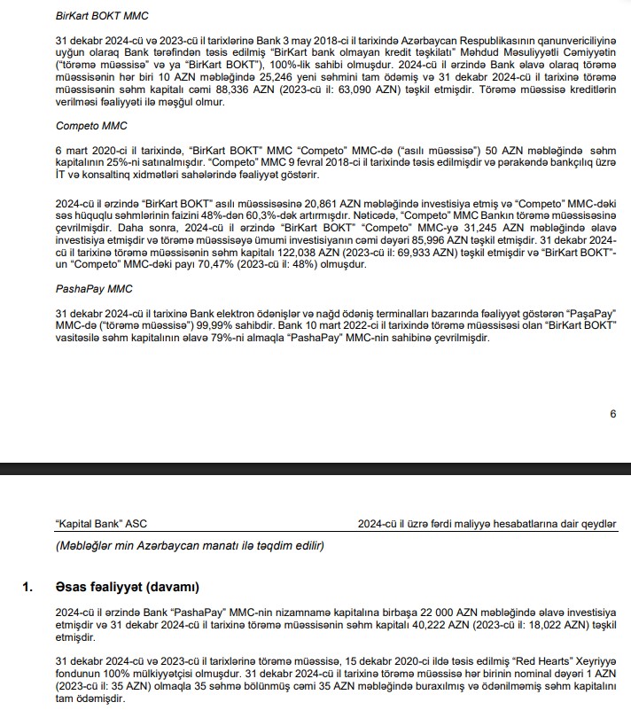 Qeyd edilib ki, 2024-cü il ərzində "Kapital Bank" əlavə olaraq törəmə müəssisənin (“BirKart BOKT”) hər biri 10 manat məbləğində 25 246 yeni səhmini tam ödəmiş və 31 dekabr 2024-cü il tarixinə törəmə müəssisənin səhm kapitalı cəmi 88 milyon 336 min manat (2023-cü il: 63 milyon 90 min manat) təşkil etmişdir. “BirKart BOKT” kreditlərin verilməsi fəaliyyəti ilə məşğul olmur.