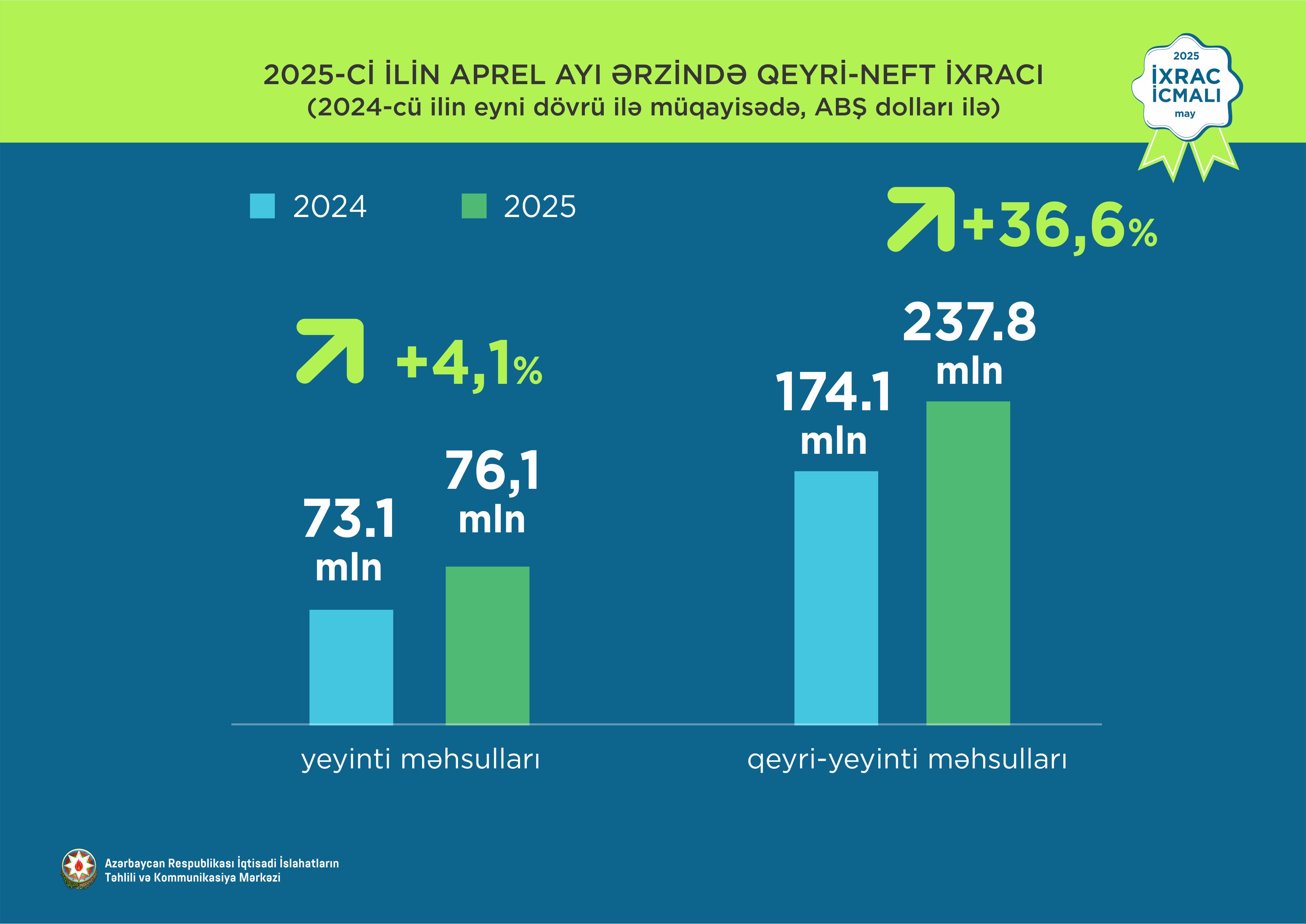İcmala əsasən, 2025-ci ilin yanvar-aprel aylarında Azərbaycanın qeyri-neft sektoru üzrə ixracı 2024-cü ilin müvafiq dövrü ilə müqayisədə 18% artaraq 1,1 milyard ABŞ dolları təşkil edib. Bu dövrdə yeyinti məhsullarının ixracı 12,1% artaraq 300.1 milyon ABŞ dollarına bərabər olub.