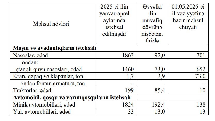 2025-ci ilin yanvar-aprel aylarında əvvəlki ilin müvafiq dövrü ilə müqayisədə traktorların istehsalı isə 14,6 faiz azalıb.