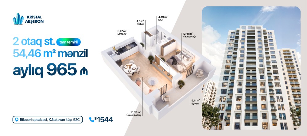 (®) "Kristal Abşeron"un Biləcəridə inşa etdiyi müasir və funksional yaşayış kompleksi həm əlverişli yerləşməsi, həm də sərfəli satış şərtləri ilə diqqət çəkir. Satışların sürətlə davam etdiyi bu layihədə mənzil sahibi olmaq üçün 36 ayadək faizsiz kredit və 20 illik ipoteka imkanı təqdim olunur. Mənzillərlə tanış olmaq üçün satış ofisinə və ya *1544-ə müraciət edə bilərsiniz.