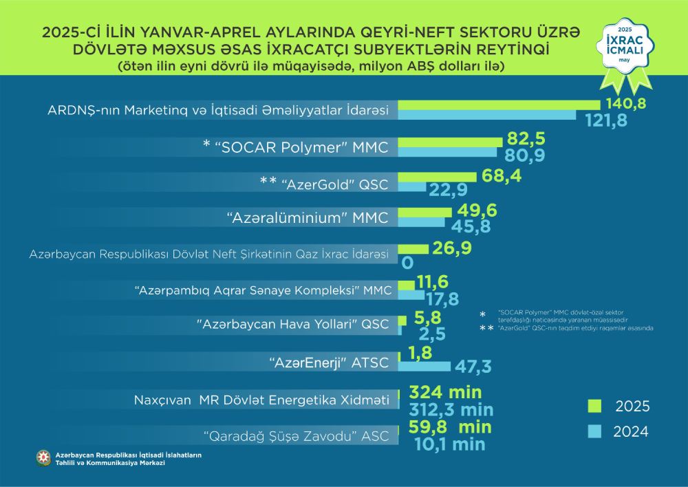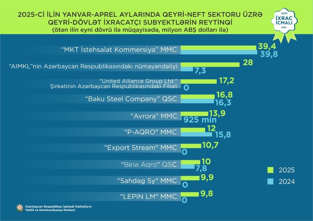 İcmala əsasən, 2025-ci ilin yanvar-aprel ayları üzrə hazırlanmış qeyri-dövlət ixracatçı subyektlərin reytinqində ilk onluqda aşağıdakı şirkətlər təmsil olunublar:
