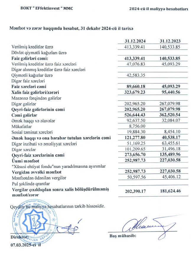 "Effektinvest BOKT" MMC 2024-cü ili 202 min manat xalis mənfəət ilə başa vurub. Kredit təşkilatı 2023-cü ili 182 min manat xalis mənfəət ilə bağlamışdı.