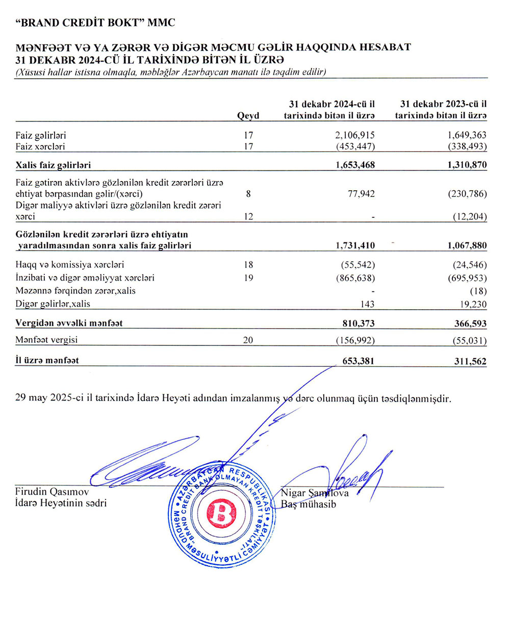 "Brand Credit Bank Olmayan Kredit Təşkilatı" MMC 31 dekabr 2024-cü il tarixində bitən il üzrə maliyyə hesabatları - ƏTRAFLI