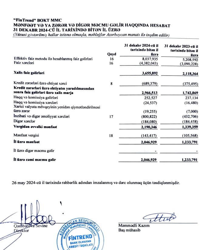 "Fin Trend BOКТ" ММС 2024-cü ili 2 milyon 47 min manat xalis mənfəət ilə başa vurub. Təşkilat 2023-cü ili 1 milyon 234 min manat xalis mənfəət ilə bağlamışdı (813 min manat və ya 65,9% artıb).