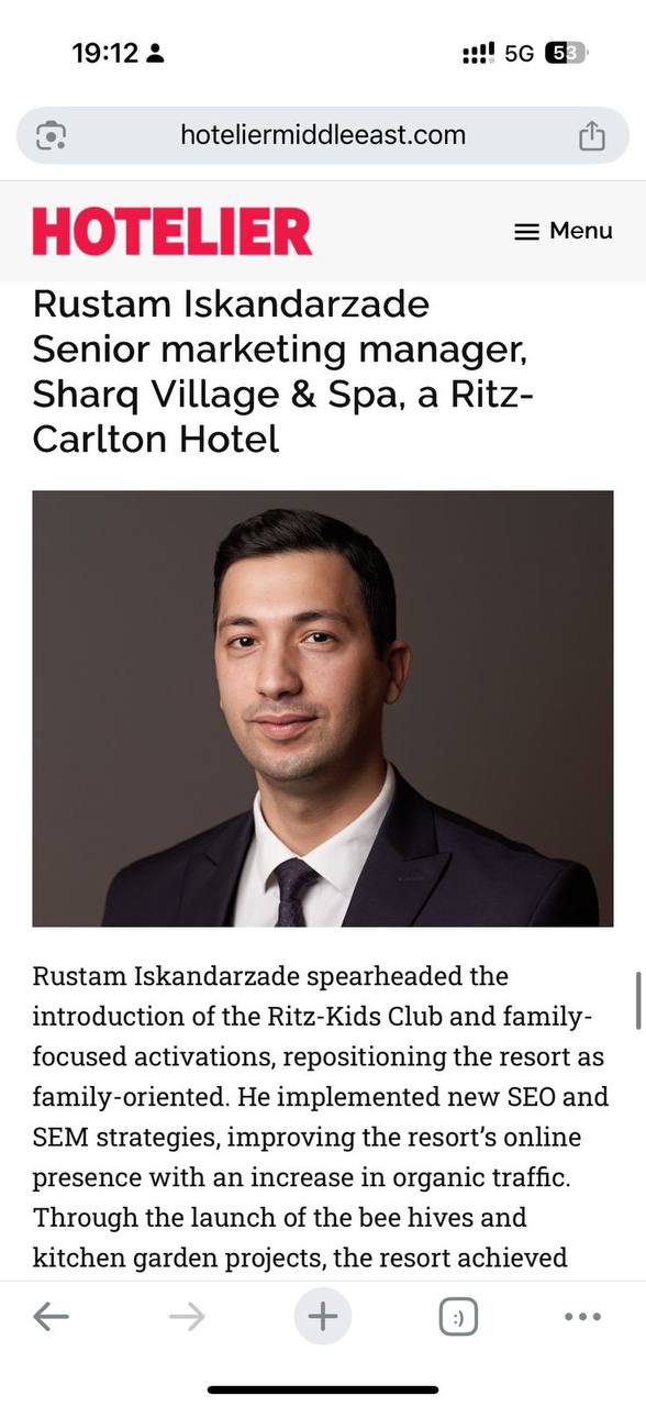 Marja.az xəbər verir ki, Yaxın Şərqdə iki lüks hotelin marketinqinə rəhbərlik edən bu adlar — Səadət Quliyeva və Rüstəm İskəndərzadədir. Hər ikisi də Azərbaycanda "PASHA Holding"ə daxil olan "Absheron Hotel Group" şirkətində çalışıblar.