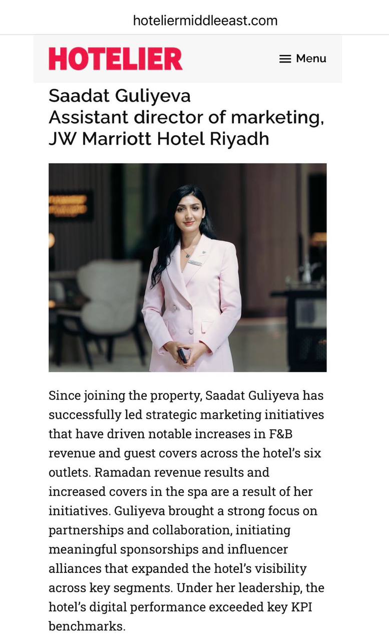 İki azərbaycanlı Yaxın Şərqin ən yaxşı 101 hotel marketinq mütəxəssisi siyahısında yer tutub. Tanış olun: Səadət Quliyeva və Rüstəm İskəndərzadəNüfuzlu "Hotelier Middle East" nəşrinin hazırladığı “Marketing Power List 2025” (Yaxın Şərqin Ən Yaxşı 101 Hotel Marketinq Mütəxəssisi) siyahısında bu il iki azərbaycanlı mütəxəssis də yer alıb.