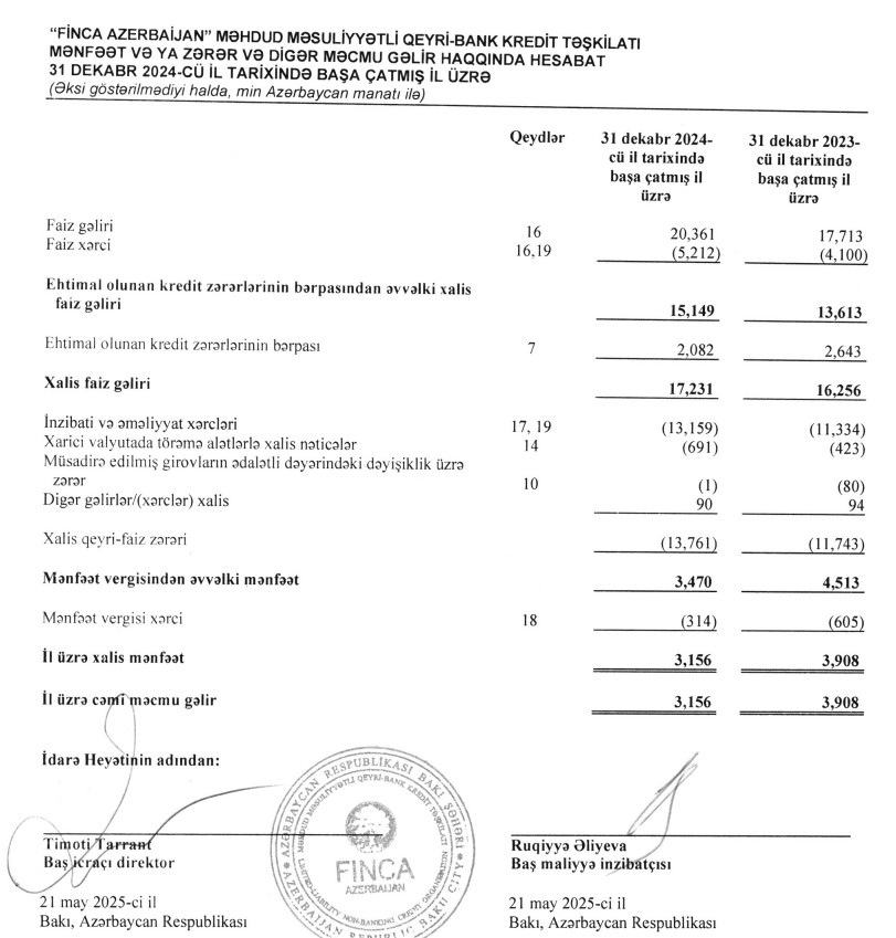 "FINCA Azerbaijan" Qeyri-Bank Kredit Təşkilatı 2024-cü ili 3 milyon 156 min manat xalis mənfəət ilə başa vurub. Halbuki, kredit təşkilatı 2023-cü ili 3 milyon 908 min manat xalis mənfəət ilə bağlamışdı. Beləliklə, ötən il "FINCA Azerbaijan"ın xalis mənfəəti 752 min manat və ya 19,2% azalıb.