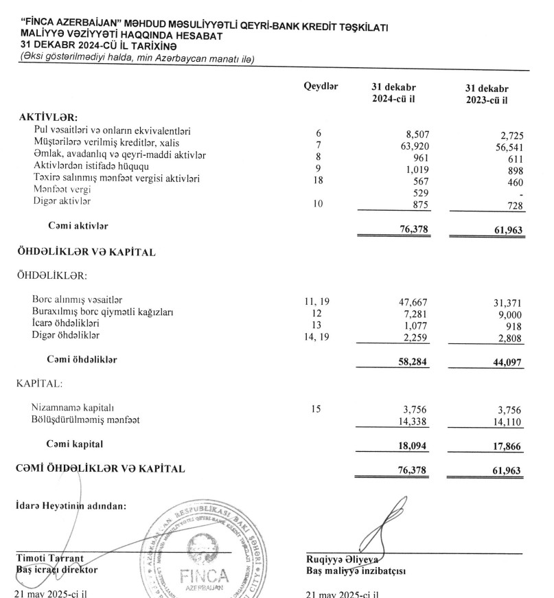 Keçən il "FINCA Azerbaijan"ın kredit portfeli (müştərilərə verilmiş kreditlər) 7 milyon 379 min manat və ya 13% artaraq 31 dekabr 2024-cü il tarixində 63 milyon 920 min manata çatıb.