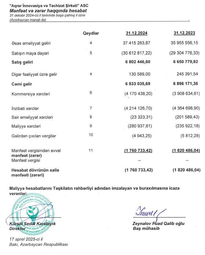 Gübrə, toxum və aqrokimyəvi məhsulların topdan satışı ilə məşğul olan "Aqrar İnnovasiya və Təchizat Şirkəti" ASC 2024-cü ili 1 milyon 761 min manat xalis zərər ilə başa vurub. Şirkət 2023-cü ili 1 milyon 820 min manat xalis zərər ilə bağlamışdı. 2023 və 2024-cü illərdə "Aqrar İnnovasiya və Təchizat Şirkəti"nin cəmi zərəri 3 milyon 581 min manatdır.