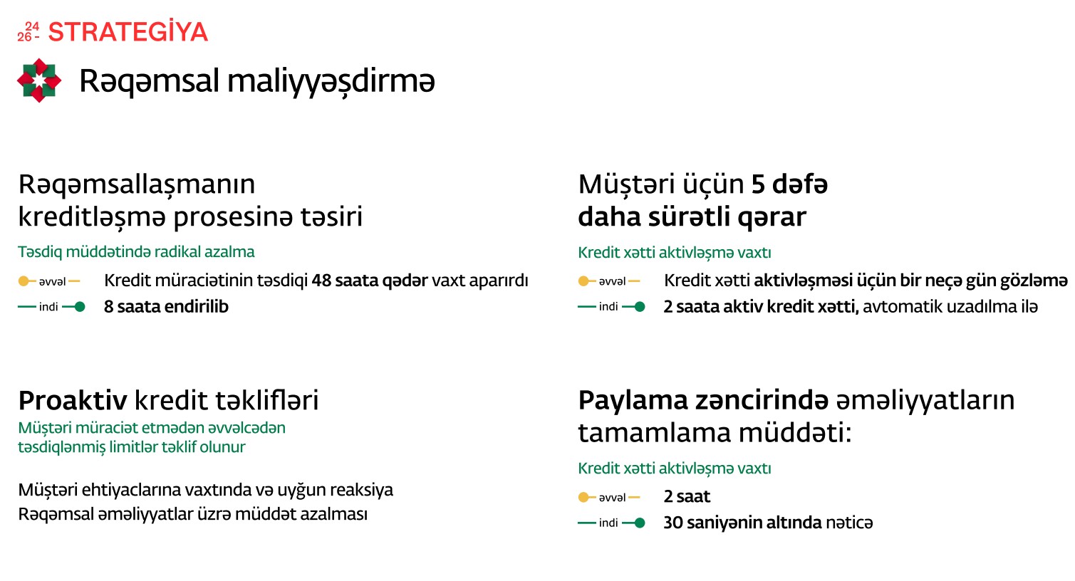 “Rəqəmsallaşmanın kreditləşmə prosesinə təsiri: əvvəl kredit müraciətinin təsdiqi 48 saata qədər vaxt aparırdı, indi 8 saata endirilib. Əgər əvvəllər müştəri kredit xəttinin aktivləşməsi üçün bir neçə gün gözləyirdisə, artıq kredit xətti avtomatik uzadılma ilə 2 saata aktiv olur.