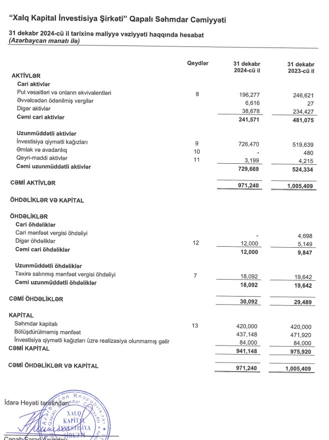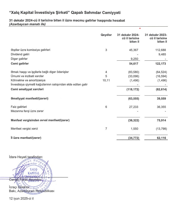 "Xalq Kapital İnvestisiya Şirkəti” QSC 2024-cü ili 35 min manat xalis zərər ilə başa vurub. Halbuki, Şirkət 2023-cü ili 62 min manat xalis mənfəət ilə bağlamışdı.