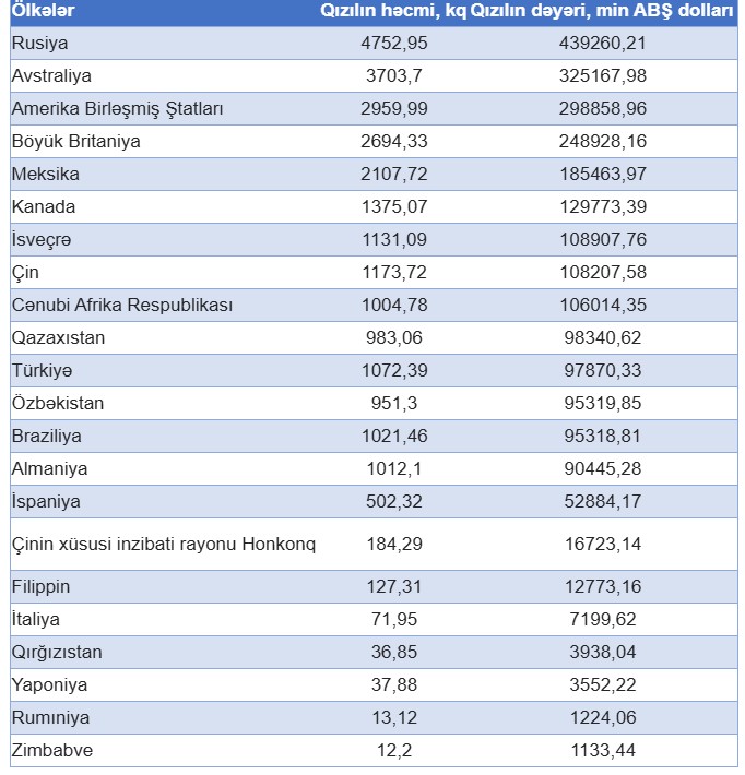 Qeyd edək ki, bu ilin ilk 4 ayında Azərbaycanda qızıl istehsalı 1026.3 kq təşkil edib. Bu dövrdə Azərbaycandan İsveçrəyə 95 milyon 426 min ABŞ dolları dəyərində 1308.6 kq emal olunmamış qızıl ixrac edilib. Bu məhsulun 1 kiloqramının orta ixrac qiyməti isə 72 min 921 ABŞ dolları təşkil edib.