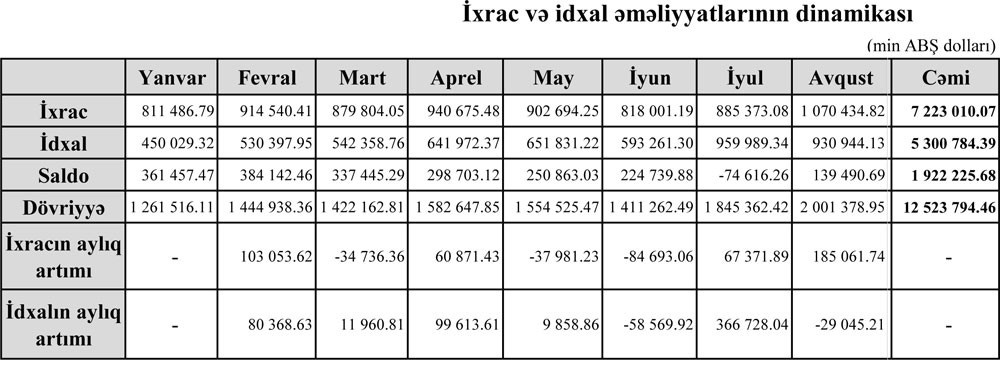 Avqustda ixrac 1 milyard 70 milyon 434.82 min dollar, idxal isə 930 milyon 944.13 min dollar təşkil edib. İyulda ixrac 885 milyon 373.08 min dollar, idxal isə 959 milyon 989.34 min dollar idi.
