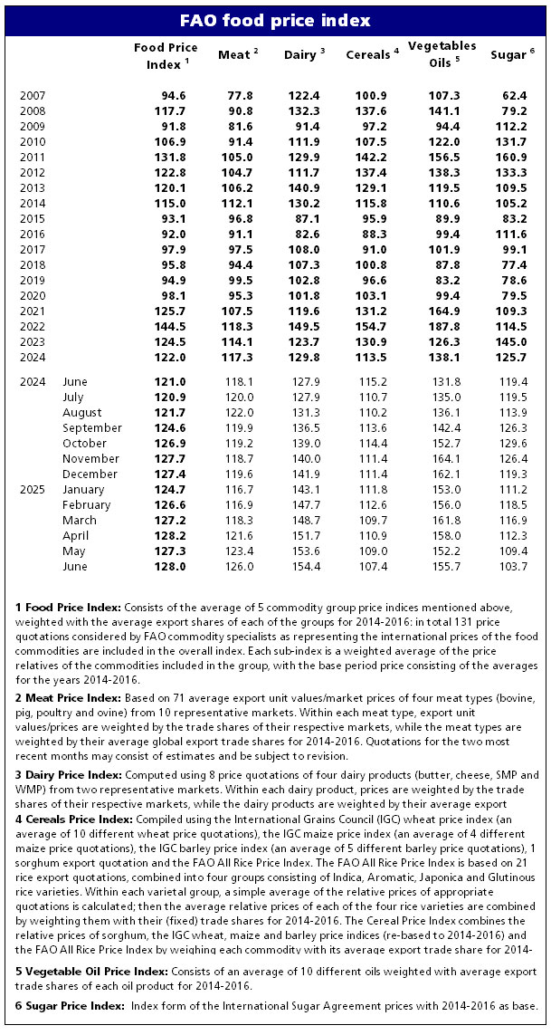 Birləşmiş Millətlər Təşkilatının Ərzaq və Kənd Təsərrüfatı Təşkilatı (FAO) iyun ayında ət, süd və bitki yağı qiymətlərindəki yüksəlmə ilə qlobal ərzaq məhsullarının qiymətlərinin bir qədər artdığını açıqlayıb.ət,Birləşmiş Millətlər Təşkilatının Ərzaq və Kənd Təsərrüfatı Təşkilatı (FAO) ət, süd və bitki yağlarının bahalaşması ilə əlaqədar olaraq iyun ayında qlobal ərzaq məhsullarının qiymətlərində may ayı ilə müqayisədə bir qədər artım olduğunu bildirib.