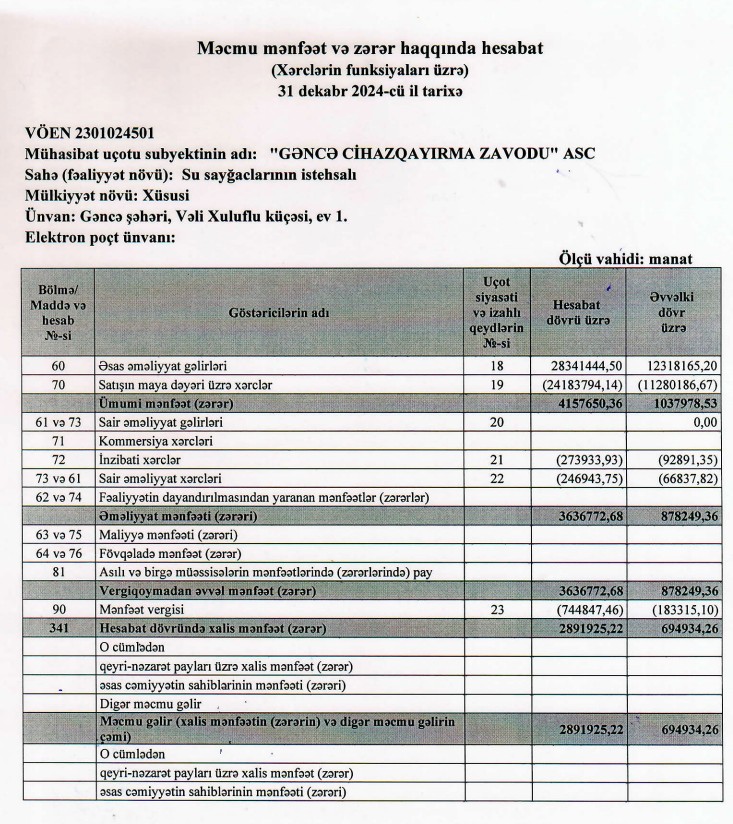 "Gəncə Cihazqayırma Zavodu" ASC 2024-cü ili 2 milyon 892 min manat xalis mənfəət ilə başa vurub. Şirkət 2023-cü ili 695 min manat xalis mənfəət ilə bağlamışdı. Beləliklə, "Gəncə Cihazqayırma Zavodu"nun xalis mənfəəti 2024-cü ildə 2023-cü illə müqayisədə 4,2 dəfə və ya 2 milyon 197 min manat artıb.