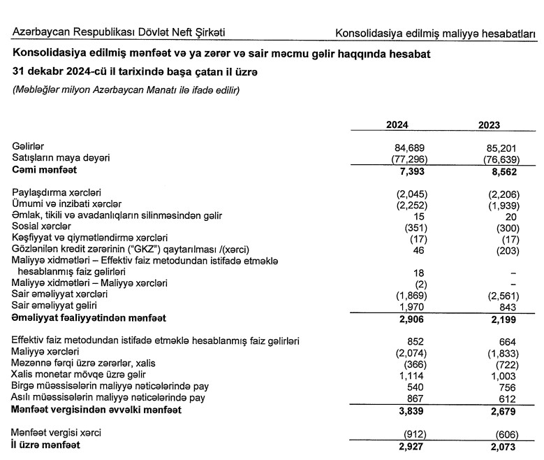 90 milyard manat gəlirdən 2,9 milyard manat xalis mənfəət qalıb. 90 milyard 111 milyon manat qazanıb, 87 milyard 184 milyon manatını xərcləyib.Azərbaycan Respublikasının Dövlət Neft Şirkəti (SOCAR) 2024-cü ili 2 milyard 927 milyon manat xalis mənfəət ilə başa vurub. Şirkət 2023-cü ili 2 milyard 73 milyon manat xalis mənfəət ilə bağlamışdı. Beləliklə, SOCAR-ın xalis mənfəəti 2024-cü ildə 2023-cü illə müqayisədə 854 milyon manat və ya 41,2% artıb. Xalis mənfəətin artması əsas əməliyyat gəlirlərinin artması ilə deyil, əsasən 1 milyard 970 milyon manat sair əməliyyat gəliri ilə əlaqədardır.