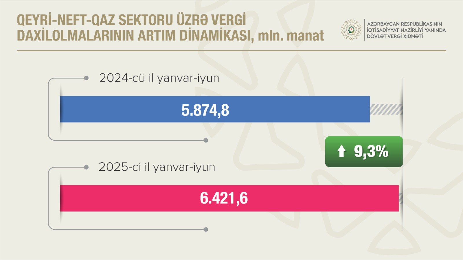 Qeyri-neft-qaz sektorundan vergi daxilolmaları 9,3 faiz artıb2025-ci ilin yanvar – iyun aylarında İqtisadiyyat Nazirliyi yanında Dövlət Vergi Xidmətinin xəttilə dövlət büdcəsinə 8 milyard 703,7 milyon manata yaxın vergi daxil olub, proqnoza 105,7 faiz əməl edilib.