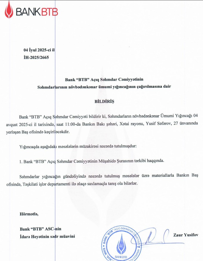 Marja xəbər verir ki, 4 avqust 2025-ci il tarixində "Bank BTB" ASC səhmdarlarının növbədənkənar Ümumi Yığıncğı keçiriləcək.