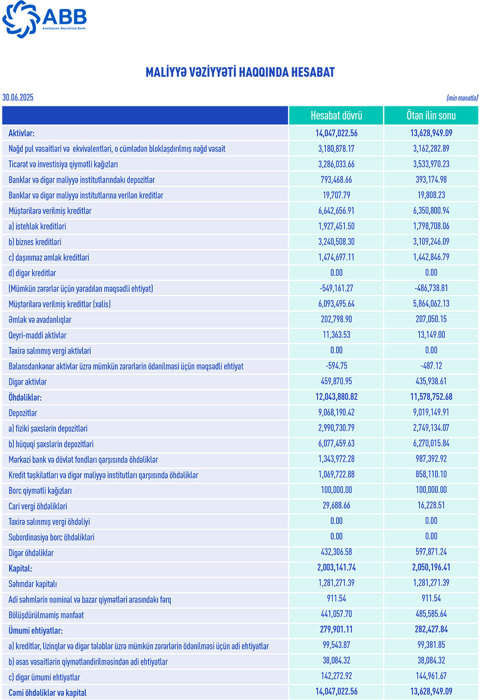 ABB-nin cəmi aktivləri 2025-ci ilin ilk 6 ayı ərzində ötən ilin sonu ilə müqayisədə 418 milyon 073 min manat və ya 3,1% artaraq 30 iyun 2025-ci tarixində 14 milyard 47 milyon 23 min manata çatıb. O cümlədən, Bankın kredit portfeli (müştərilərə verilmiş kreditlər) 291 milyon 856 min manat və ya 4,6% artaraq 6 milyard 642 milyon 657 min manata yüksəlib.