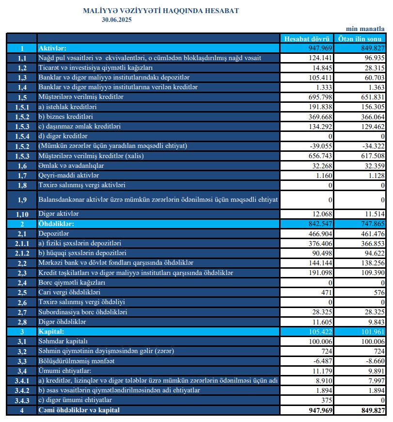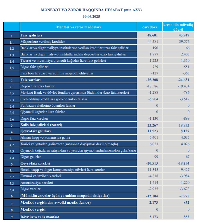 "Turanbank" ASC 2025-ci ilin ilk 6 ayını (yanvar-iyun) 2 milyon 173 min manat xalis mənfəət ilə başa vurub.