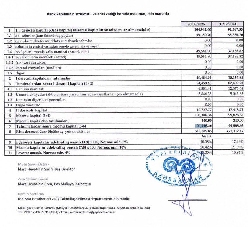 30 iyun 2025-ci il tarixində “Yapı Kredi Bank Azərbaycan”ın 104 milyon 946 min manat məcmu kapitala malik olub.