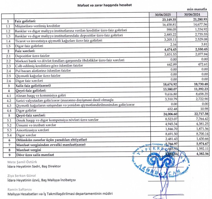 Müqayisə üçün qeyd edək ki, 2024-cü ilin ilk 6 ayı ərzində “Yapı Kredi Bank Azərbaycan”ın cəmi əməliyyat gəlirləri (faiz və qeyri-faiz gəlirləri) 32 milyon 672 min manat, cəmi əməliyyat xərcləri (faiz və qeyri-faiz xərcləri) 25 milyon 267 min manat, gəlirlər xərcləri üstələdiyindən əməliyyat mənfəəti 7 milyon 405 min manat təşkil etmişdi. Bank əməliyyat mənfəətindən 1 milyon 431 min manat mümkün zərərlər üçün yaradılan məqsədli ehtiyatlara ayırmış və 1 milyon 592 min manat mənfəət vergisi ödəmişdi. Bununla əlaqədar olaraq “Yapı Kredi Bank Azərbaycan”ın xalis mənfəəti 4 milyon 382 min manat təşkil etmişdi.