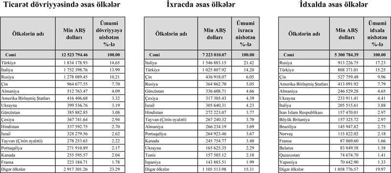 Azərbaycan ən çox malı İtaliya, Türkiyə, Çin, Rusiya və Gürcüstana ixrac edir. Ən çox malı isə Rusiya, Türkiyə, Çin, ABŞ və Almaniyadan alırıq.