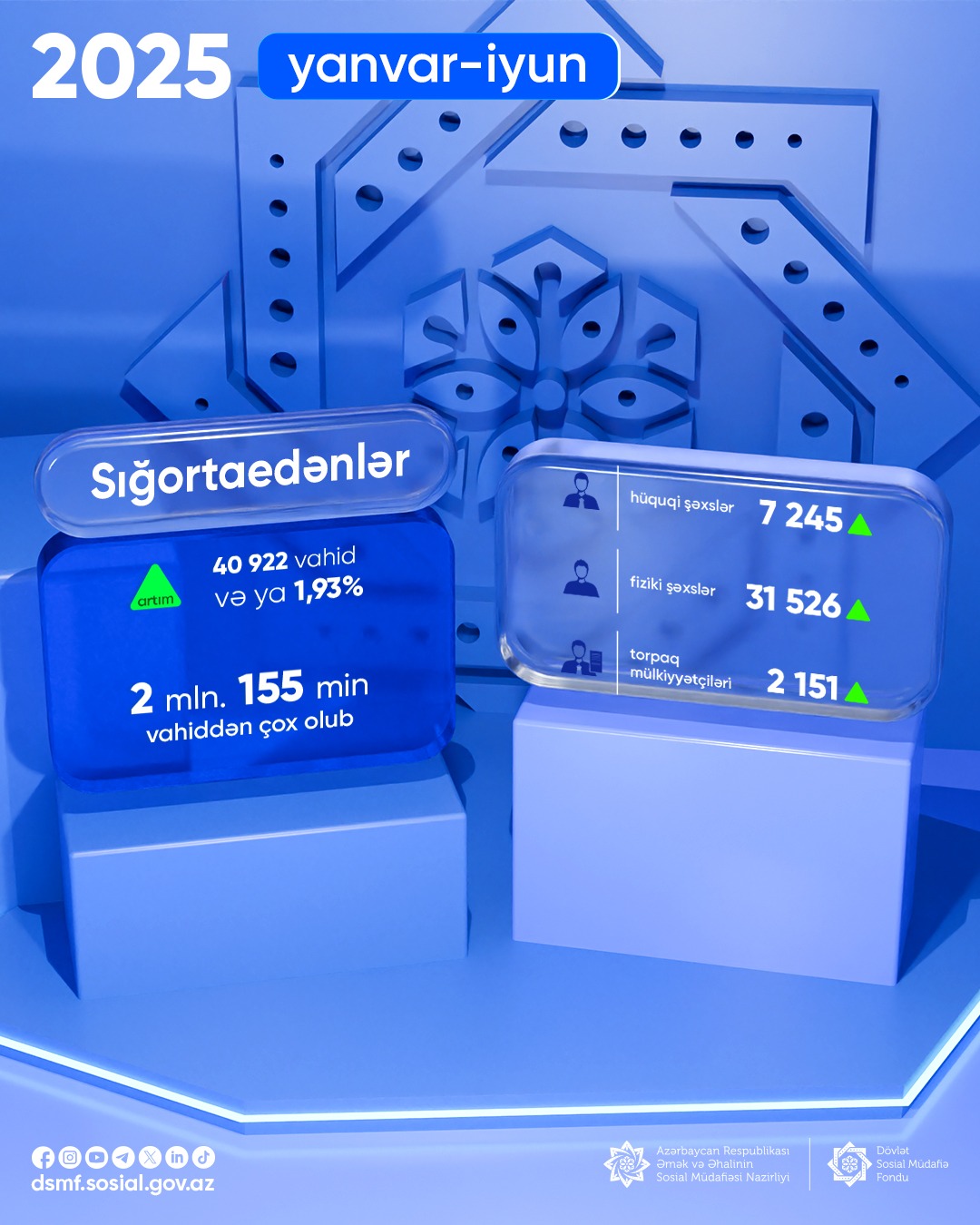 2025-ci ilin yanvar-iyun aylarında fərdi uçot sistemində qeydə alınan sığortaedənlərin sayı 40 min 922 vahid və ya 1,93% artaraq 2 milyon 155 min vahiddən çox olub.
